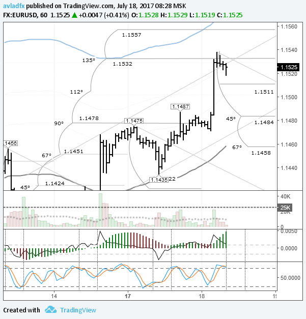 И вчера, и сегодня укрепление евро вызвал новостной фон. Он позволил покупателям загнать евро до 1,1538 против циклов. Внутридневные циклы по-прежнему указывают на ослабление евро в течение 22-24 часов. По сути, если они окажутся сильнее эмоций спекулянтов, курс евро вернётся к трендовой линии на 1,1484 (45 гр.). Падение евро ниже 1,1511 будет означать, что эффект от новости пропал.