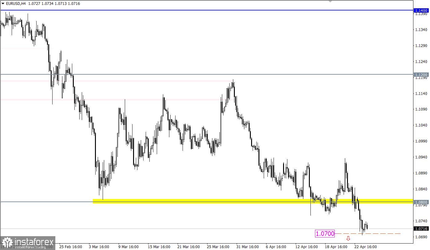 В ходе активного снижения возник сигнал локальной перепроданности курса евро в краткосрочном периоде. Это привело к замедлению нисходящего хода в районе значения 1.0700.