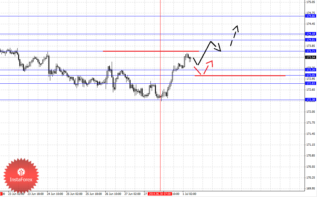 По паре Фунт/Иена ключевыми уровнями в масштабе Н1 являются: 174.66, 174.18, 174.01, 173.71, 173.20, 173.05, 172.83 и 172.38. Здесь мы следим за формированием локальной структуры для верха от 30 июня. Продолжения движения кверху, ожидаем после пробоя 173.71, в данном случае цель – 174.01, возле этого уровня консолидация. Проход ценой шумового диапазона 174.01 – 174.18 должен сопровождаться выраженным восходящим движением, здесь потенциальная цель – 174.66, возле этого уровня ожидаем консолидированное движение. Краткосрочное нисходящее движение, возможно в коридоре 173.20 – 173.05, пробой последнего значения приведет к углубленной коррекции, здесь цель – 172.83, от этого уровня ожидаем ключевой разворот к верху, его проход ценой будет располагать к развитию нисходящей структуры, в данном случае потенциальная цель – 172.38.