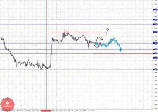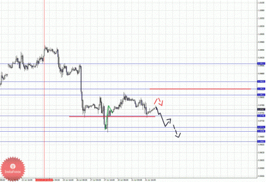 По паре Доллар/Франк ключевым уровня являются: 0.9912, 0.9855, 0.9832, 0.9813, 0.9746, 0.9711, 0.9698 и 0.9665. Здесь мы следим за развитием нисходящей структуры от 24 июля. Продолжения движения книзу ожидаем после пробоя 0.9746, в данном случае цель 0.9711, в коридоре 0.9711 – 0.9698 консолидация цены. Потенциальным значением для низа считаем уровень 0.9665, по достижении которого ожидаем откат кверху. Краткосрочное восходящее движение ожидаем в коридоре 0.9813 – 0.9832, пробой последнего значения приведет к движению до 0.9855, отсюда высока вероятность разворота книзу, его пробой будет располагать к развитию восходящей структуры. Уровень 0.9912 интересен с точки зрения среднесрочной перспективы.