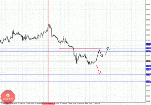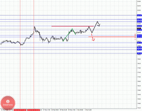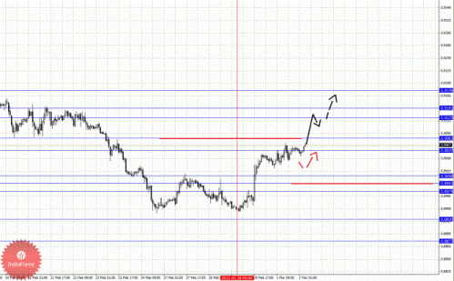 По паре Австралийский доллар/Доллар ключевыми уровнями являются: 1.0901, 1.0860, 1.0817, 1.0805, 1.0750, 1.0716, 1.0687, 1.0635 и 1.0612. Здесь отмены нисходящей структуры от 29 февраля ожидаем после прохода ценой шумового диапазона 1.0805 – 1.0817, в данном случае первая цель 1.0860. Уровень 1.0750 является ключевым сопротивлением для низа, его пробой позволит рассчитывать на развитие нисходящей структуры, здесь первая цель 1.0716. Далее ключевые уровни для нисходящего движения пока остаются без изменения.