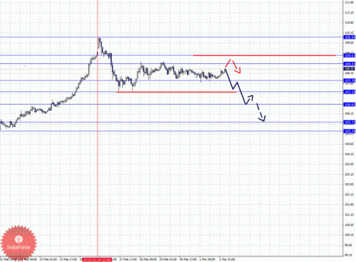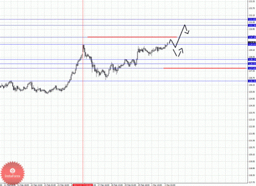 По паре Евро/Йена ключевыми уровнями являются: 109.95, 109.03, 108.63, 107.79, 107.24, 106.62, 105.73 и 105.29. Здесь основные цели остались без изменения, и мы продолжаем следить за нисходящей структурой от 24 февраля. Продолжения движения книзу ожидаем после пробоя 107.79, в данном случае цель – 107.24. Пробой уровня 107.24 позволит рассчитывать на движение к 106.62, в этом диапазоне консолидация цены. Пробой уровня 106.62 должен сопровождаться импульсивным движением к уровню 105.73. Потенциальным значением для низа считаем уровень 105.29, по достижении которого ожидаем консолидацию в коридоре 105.29 – 105.73. Краткосрочное восходящее движение ожидаем в диапазоне 108.63 – 109.03, пробой последнего значения приведет к отмене нисходящей структуры от 24 февраля, в данном случае потенциальная цель 109.95.