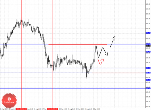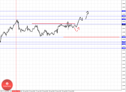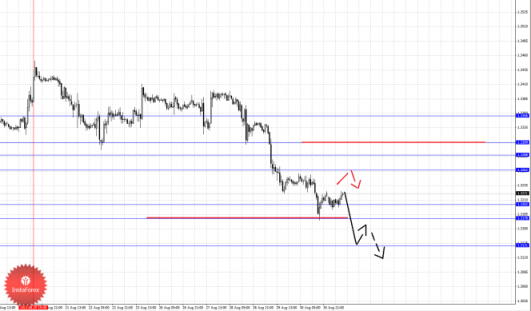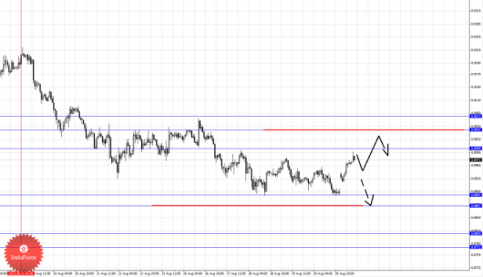 По паре Доллар/Канадский доллар ключевыми уровнями являются: 1.0613, 1.0585, 1.0567, 1.0541, 1.0467, 1.0440, 1.0428 и 1.0405. Здесь цена близка к тому, чтобы продолжить развитие восходящей тенденции в масштабе Н1, чего мы ожидаем после пробоя 1.0541. Продолжения движения книзу ожидаем после пробоя 1.0467, в данном случае цель 1.0440, в коридоре 1.0440–1.0428 консолидация цены. Потенциальным значением для низа считаем уровень 1.0405, по достижении которого ожидаем откат кверху. Уровень 1.0541 является ключевым сопротивлением для продолжения развития восходящего цикла от 9 августа, его пробой позволит рассчитывать на движение к первой потенциальной цели – 1.0567, далее уровня для верха остались без изменения.