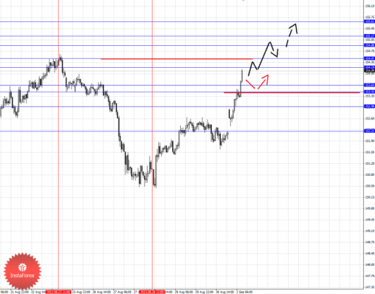 По паре Фунт/Иена ключевыми уровнями являются: 155.62, 155.17, 154.88, 154.47, 154.19, 153.64, 153.43, 152.98 и 152.21. Здесь мы следим за развитием восходящего цикла от 28 августа. Краткосрочное восходящее движение ожидаем в диапазоне 154.19–154.47, пробой последнего значения должен сопровождаться выраженным восходящим движением, в данном случае цель 154.88, в коридоре 154.88–155.17 консолидация цены. Потенциальным значением для верха считаем уровень 155.62, по достижении которого ожидаем откат книзу. Краткосрочное нисходящее движение возможно в коридоре 153.64–153.43, пробой последнего значения приведет к углубленному движению, здесь цель 152.98, от этого уровня ожидаем ключевой разворот кверху, его пробой будет располагать к развитию нисходящей структуры, в данном случае потенциальная цель – 152.21.
