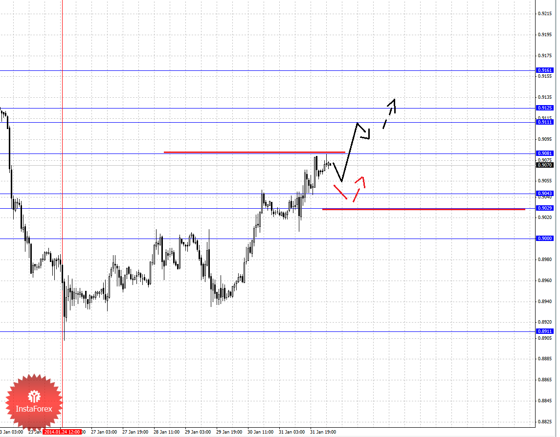 По паре Доллар/Франк ключевым уровня являются: 0.9161, 0.9125, 0.9111, 0.9081, 0.9043, 0.9029 и 0.9000. Здесь продолжения развития восходящей структуры от 24 января ожидаем после пробоя 0.9081, в данном случае цель – 0.9111, в коридоре 0.9111 – 0.9125 консолидация цены. Пробой уровня 0.9125 позволит рассчитывать на движение к потенциальной цели – 0.9161, по достижении которой, ожидаем откат книзу. Краткосрочное нисходящее движение возможно в диапазоне 0.9043 – 0.9029, отсюда высока вероятность разворота кверху, пробой уровня 0.9029 будет располагать к развитию нисходящей структуры, в данном случае первая цель – 0.9000.