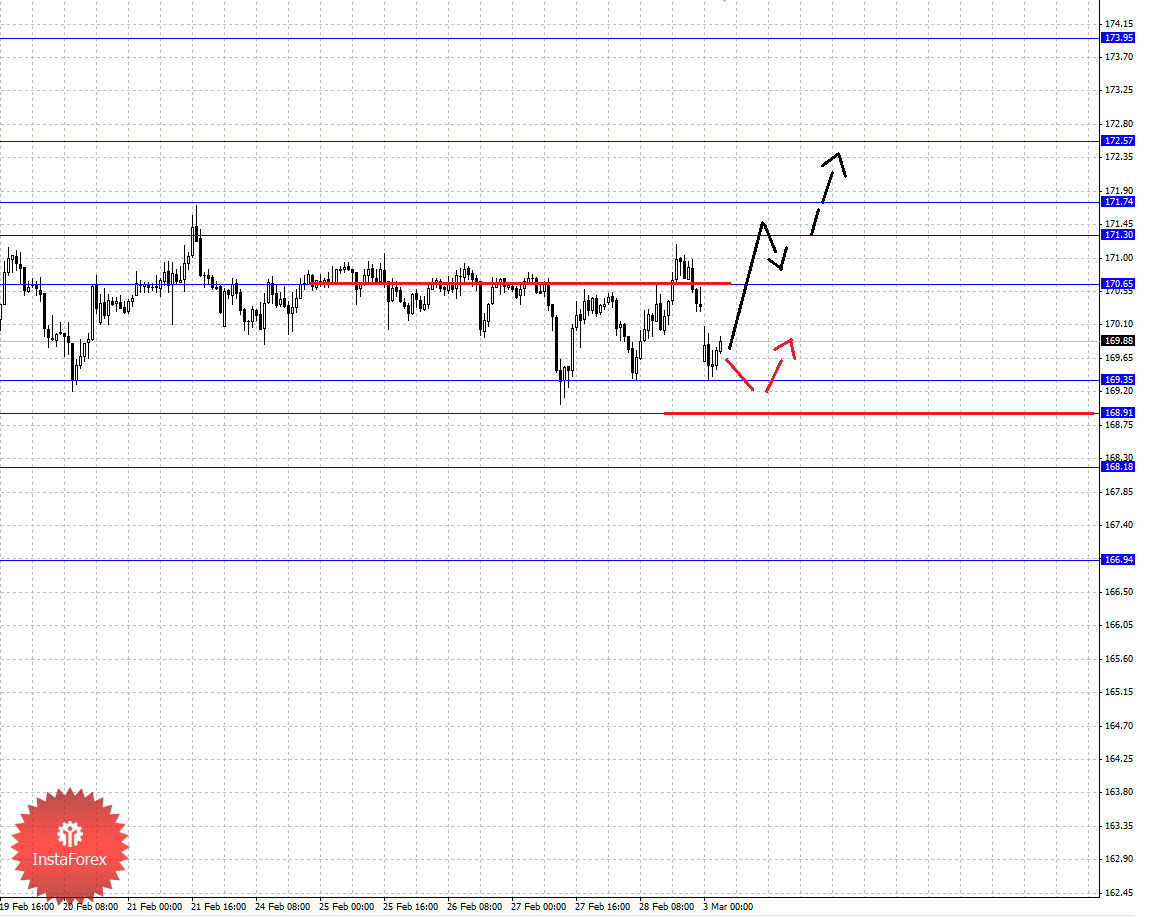 По паре Евро/Иена ключевыми уровнями являются: 142.85, 142.51, 141.62, 141.20, 140.49, 139.32, 139.10, 138.78 и 138.17. Здесь от 27 февраля формируется потенциал для восходящего движения. Продолжения движения кверху ожидаем после пробоя 140.49, в данном случае цель – 141.20, в коридоре 141.20 – 141.62 консолидация цены. Пробой уровня 141.62 должен сопровождаться выраженным восходящим движением, в данном случае цель – 142.51. Потенциальным значением для верха считаем уровень 142.85, по достижении которого ожидаем консолидацию. Краткосрочное нисходящее движение возможно в коридоре 139.32 – 139.10, пробой последнего значения приведет к движению до уровня 138.78, пробой которого, в свою очередь, начнет развитие нисходящей структуры в масштабе Н1, здесь первая цель – 138.17.