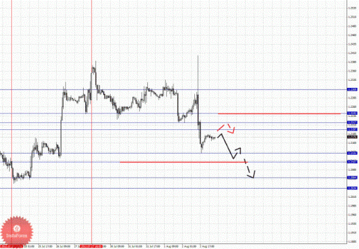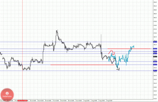 По паре Фунт/Иена ключевыми уровнями являются: 122.02, 121.79, 121.61, 121.05, 120.85, 120.37 и 120.26. Здесь мы продолжаем следить за развитием нисходящей структуры от 27 июля. Краткосрочное нисходящее движение возможно в коридоре 121.05 – 120.85, пробой последнего значения должен сопровождаться выраженным нисходящим движением, в данном случае цель 120.37. Диапазон 120.37 – 120.26 шумовой, из него мы ожидаем разворот кверху. Краткосрочное восходящее движение возможно в диапазоне 121.61 – 121.79, пробой последнего значения приведет к углубленному движению, здесь потенциальная цель 122.02.