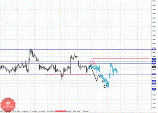 По паре Доллар/Иена ключевыми уровнями являются: 78.61, 78.39, 78.33, 78.29, 78.03, 77.88, 77.82 и 77.69. Здесь восходящая структура от 1 августа по-прежнему остается актуальной для определения целей, ее отмены ожидаем после пробоя 78.03, в данном случае цель 77.88, в коридоре 77.88 – 77.82 консолидация цены. Потенциальным значением для низа считаем уровень 77.69, по достижении которого ожидаем консолидацию. Краткосрочное восходящее движение возможно в диапазоне 78.29 – 78.39, пробой последнего значения будет располагать к формированию восходящей структуры, в данном случае потенциальная цель – 78.61.