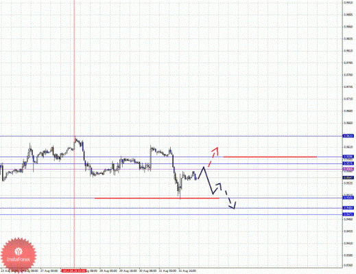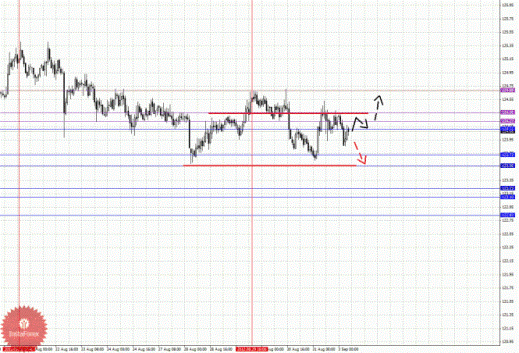 По паре Фунт/Иена ключевыми уровнями являются: 124.68, 124.36, 124.23, 124.11, 123.73, 123.56, 123.23, 123.10 и 122.83. Здесь ключевые цели остались без изменения и мы продолжаем следить за локальной нисходящей структурой от 29 августа. Краткосрочное нисходящее движение ожидаем в коридоре 123.73 – 123.56, пробой последнего значения должен сопровождаться выраженным нисходящим движением, в данном случае цель 123.23. В коридоре 123.23 – 123.10 консолидация цены. Потенциальным значением для низа считаем уровень 122.83, по достижении которого ожидаем откат кверху. Краткосрочное восходящее движение возможно в коридоре 124.11 – 124.23, пробой последнего значения приведет к углубленному движению, в данном случае цель 124.36, от этого уровня высока вероятность разворота книзу, его пробой будет располагать к развитию восходящей структуры, в данном случае цель – 124.68.