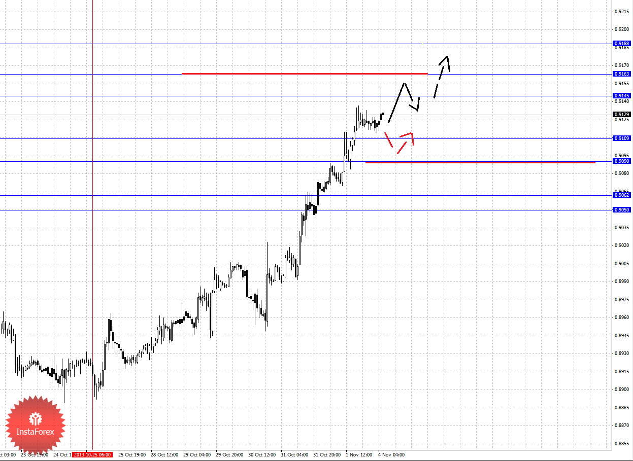 По паре Доллар/Франк ключевым уровня являются: 0.9188, 0.9163, 0.9145, 0.9109, 0.9090, 0.9062 и 0.9050. Здесь, продолжения движения к ерху ожидаем после пробоя 0.9145, в данном случае цель – 0.9163, в этом диапазоне консолидация цены. Потенциальным значением для верха от 25 октября считаем уровень 0.9188, по достижении которого ожидаем откат книзу. Краткосрочное нисходящее движение возможно в коридоре 0.9109 – 0.9090, пробой последнего значения будет располагать к формированию нисходящей структуры, в данном случае цель – 0.9062. Диапазон 0.9062 – 0.9050 шумовой.