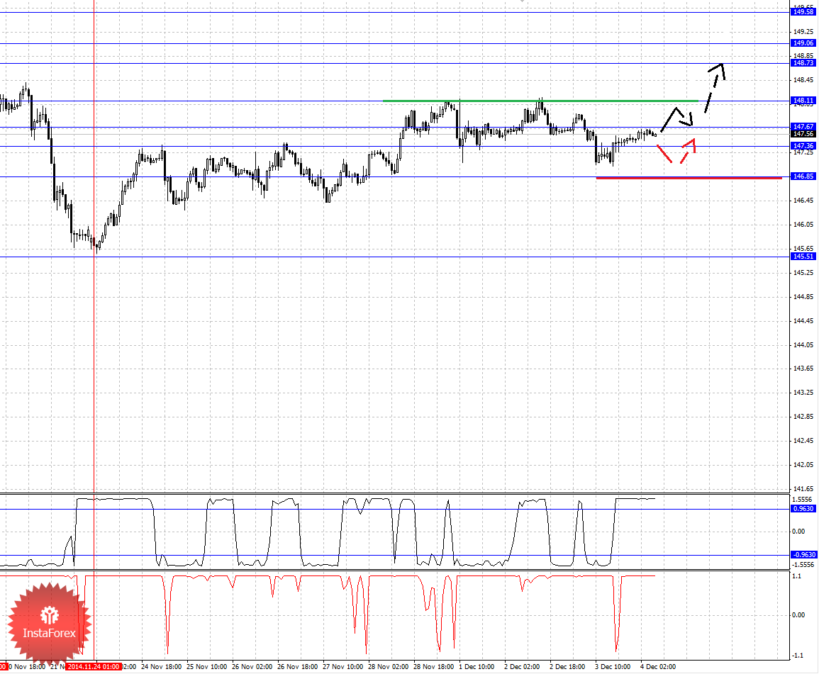 По паре Евро/Иена ключевыми уровнями в масштабе Н1 являются: 149.58, 149.06, 148.73, 148.11, 147.67, 147.36 и 146.85. Здесь, мы ожидаем развития восходящей структуры от 24 ноября. Продолжения движения к верху, возможно после пробоя 148.11, в данном случае цель – 148.73, в коридоре 148.73 – 149.60 консолидация цены. Потенциальным значением для верха, считаем уровень 149.58, по достижении которого, ожидаем откат к низу. Краткосрочное нисходящее движение, возможно в коридоре 147.67 – 147.36, пробой последнего значения приведет к углубленной коррекции, здесь цель – 146.85.