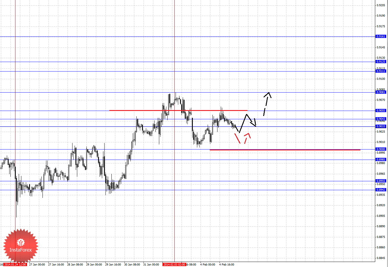 По паре Доллар/Франк ключевым уровня являются: 0.9161, 0.9125, 0.9111, 0.9081, 0.9055, 0.9043, 0.9033, 0.9000, 0.8985, 0.8955 и 0.8942. Здесь от 3 февраля формируется потенциал для нисходящего движения, однако пока цена не вышла из корректировочной зоны восходящего цикла от 24 января. Краткосрочное нисходящее движение ожидаем в коридоре 0.9000 – 0.8985, пробой последнего значения будет располагать к развитию выраженного нисходящего движения, в данном случае цель – 0.8955. Потенциальным значением для низа считаем уровень – 0.8942, по достижении которого ожидаем консолидацию. Краткосрочное нисходящее движение, возможно в диапазоне 0.9033 – 0.9043, пробой последнего значения приведет к углубленной коррекции, здесь цель – 0.9055, этот уровень является ключевым сопротивлением для последующего развития восходящей структуры, здесь первая цель – 0.9081.