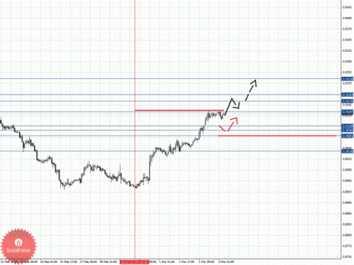По паре Доллар/Франк ключевым уровня являются: 0.9238, 0.9194, 0.9176, 0.9147, 0.9108, 0.9096, 0.9081 и 0.9038. Здесь мы продолжаем следить за восходящей структурой от 29 февраля. Продолжения движения кверху ожидаем после пробоя 0.9147, в данном случае цель 0.9176, в коридоре 0.9176 – 0.9194 консолидация цены. Пробой уровня 0.9194 должен сопровождаться выраженным восходящим движением к потенциальной цели – 0.9238, по достижении этого уровня ожидаем откат книзу. Краткосрочное нисходящее движение возможно в коридоре 0.9108 – 0.9096, пробой последнего значения приведет к углубленной коррекции, здесь цель 0.9081, от этого уровня высока вероятность разворота кверху, его пробой окажет негативное влияние на развитие восходящей тенденции в масштабе Н1. Уровень 0.9038 является ключевой поддержкой для восходящего цикла от 29 февраля и интересен с точки зрения среднесрочной перспективы.