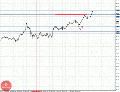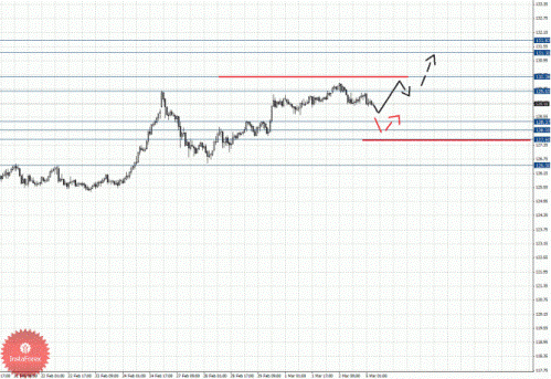 По паре Евро/Доллар следим за развитием нисходящего цикла от 29 февраля. По паре Доллар/Франк следим за развитием восходящей структуры от 29 февраля. По паре Фунт/Доллар цена близка к отмене восходящей структуры от 23 февраля, для чего необходим пробой 1.5793. По паре Доллар/Йена следим за развитием восходящей структуры от 28 февраля. По паре Евро/Йена ключевые цели остались без изменения, и нисходящая структура от 24 февраля здесь по-прежнему актуальна. По паре Фунт/Йена продолжения движения кверху ожидаем после пробоя 130.28.