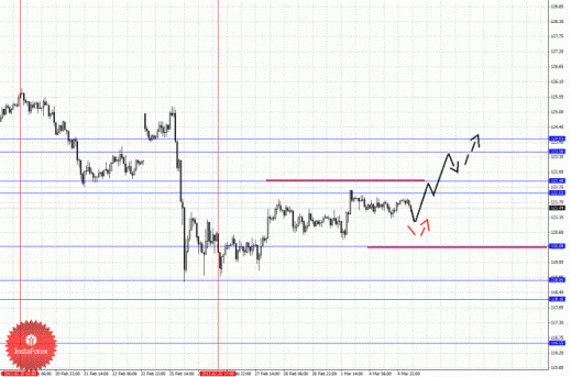 По паре Евро/Иена ключевыми уровнями являются: 124.03, 123.56, 122.48, 122.03, 120.09, 118.85, 118.16 и 116.55. Здесь от 26 февраля формируются потенциальные начальные условия для восходящего движения. Краткосрочное движение кверху ожидаем в коридоре 122.03 – 122.48, пробой последнего значения должен сопровождаться выраженным восходящим движением, в данном случае цель 123.56. Потенциальным значением для верха считаем уровень 124.03, по достижении которого ожидаем консолидированное движение. Уровень 120.09 является ключевой поддержкой для верха, его пробой будет располагать к развитию нисходящей структуры, в данном случае первая цель 118.85.