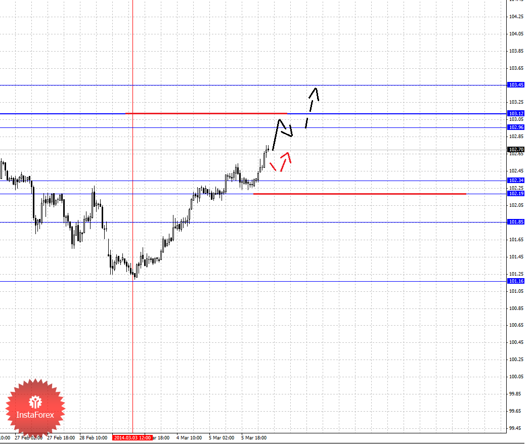 По паре Доллар/Иена ключевыми уровнями являются: 103.45, 103.12, 102.96, 102.34, 102.19, 101.85 и 101.16. Здесь мы следим за развитием восходящей структуры от 3 марта. На текущий момент ожидаем движение к уровню 102.96, в коридоре 102.96 – 103.12 консолидация цены. Потенциальным значением для верха считаем уровень 103.45, по достижении которого ожидаем консолидацию. Краткосрочное нисходящее движение возможно в коридоре 102.34 – 102.19, пробой последнего значения приведет к углубленной коррекции, здесь цель – 101.85, от этого уровня ожидаем ключевой разворот кверху, его проход ценой будет располагать к развитию нисходящей тенденции, в данном случае цель – 101.16.