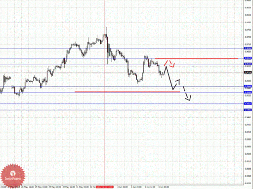 По паре Доллар/Канадский доллар ключевыми уровнями являются: 1.0416, 1.0387, 1.0372, 1.0363, 1.0326, 1.0314, 1.0290, 1.0279 и 1.0251. Здесь мы следим за развитием нисходящей структуры от 4 июня. Продолжения движения книзу ожидаем после прохода ценой шумового диапазона 1.0326 – 1.0314, в данном случае цель 1.0290, в коридоре 1.0290 – 1.0279 консолидация цены. Потенциальным значением для низа считаем уровень 1.0251, по достижении которого ожидаем откат кверху. Краткосрочное восходящее движение возможно в коридоре 1.0363 – 1.0372, пробой последнего значения приведет к углубленной коррекции, в данном случае цель – 1.0387. Уровень 1.0387 является ключевым сопротивлением для верха, его пробой будет располагать к оформлению локальной восходящей структуры для продолжения движения к верху в масштабе Н1, в данном случае потенциальная цель – 1.0416.
