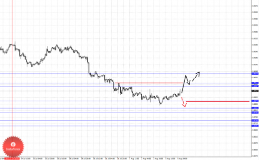 По паре Доллар/Канадский доллар ключевыми уровнями являются: 1.0520, 1.0496, 1.0456, 1.0437, 1.0412, 1.0341, 1.0323, 1.0299 и 1.0244. Здесь мы продолжаем следить за восходящей структурой от 31 июля. Продолжения движения кверху ожидаем после пробоя 1.0412, в данном случае цель 1.0437, в коридоре 1.0437–1.0456 консолидация цены. Пробой уровня 1.0456 должен сопровождаться выраженным восходящим движением, в данном случае цель – 1.0496. Потенциальным значением для верха считаем уровень 1.0520, по достижении которого ожидаем консолидированное движение. Краткосрочное нисходящее движение возможно в коридоре 1.0341–1.0323, пробой последнего значения приведет к углубленному движению, здесь цель 1.0299, от этого уровня высока вероятность разворота кверху, его пробой привет к развитию нисходящей структуры, в данном случае потенциальная цель – 1.0244.