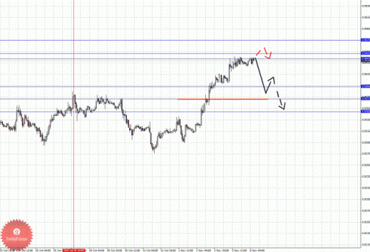 По паре Доллар/Канадский доллар ключевыми уровнями являются: 1.0022, 0.9996, 0.9982, 0.9965, 0.9924, 0.9915, 0.9899, 0.9888 и 0.9867. Здесь мы продолжаем следить за развитием нисходящей структуры от 30 октября. Продолжения движения кверху ожидаем после прохода ценой шумового диапазона 0.9924 – 0.9915, в данном случае цель 0.9899, в коридоре 0.9899 – 0.9888 консолидация цены. Потенциальным значением для низа считаем уровень 0.9867, по достижении которого ожидаем откат кверху. Краткосрочное восходящее движение возможно после пробоя 0.9965, в данном случае цель 0.9982. Диапазон 0.9982 – 0.9996 является ключевой поддержкой для нисходящей структуры, в нем возможно оформление начальных условий для развития восходящего движения. Потенциальным значением для верха считаем уровень 1.0022, движение к которому ожидаем после пробоя 0.9996.