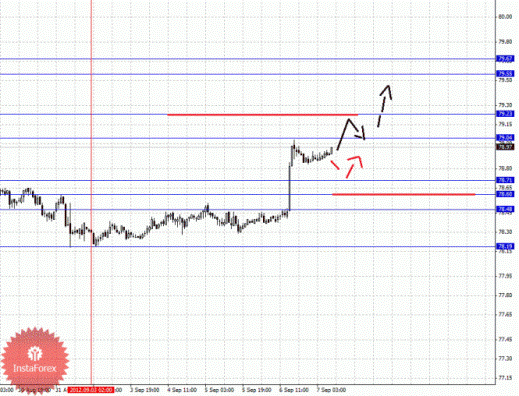 По паре Доллар/Иена ключевыми уровнями являются: 79.67, 79.55, 79.23, 79.04, 78.71, 78.60, 78.48 и 78.19. Здесь мы следим за восходящей структурой от 3 сентября. Продолжения движения кверху ожидаем после пробоя 79.04, в данном случае цель 79.23, в этом диапазоне консолидация цены. Пробой уровня 79.23 должен сопровождаться выраженным восходящим движением, в данном случае потенциальная цель – 79.55, по достижении которого ожидаем консолидированное движение в коридоре 79.55 – 79.67. Краткосрочное нисходящее движение возможно в коридоре 78.71 – 78.60, пробой последнего значения приведет к углубленному движению, в данном случае цель 78.48, от этого уровня высока вероятность разворота кверху, его пробой будет располагать к развитию нисходящей структуры, здесь потенциал находится на отметке - 78.19.