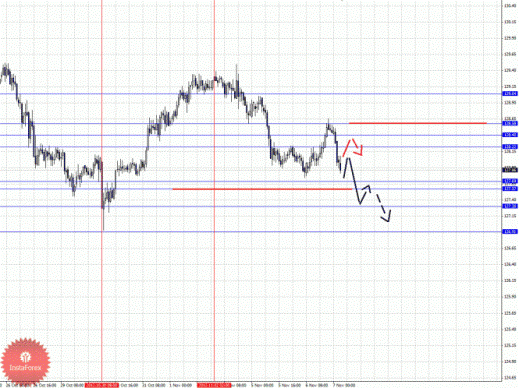 По паре Фунт/Иена ключевыми уровнями являются: 129.04, 128.58, 128.40, 128.22, 127.69, 127.57, 127.30 и 126.91. Здесь нисходящую структуру от 2 ноября мы рассматриваем в качестве потенциала для развития нисходящего движения. Продолжения движения книзу ожидаем после прохода ценой шумового диапазона 127.69 – 127.57, в данном случае цель 127.30, возле этого уровня консолидация цены. Потенциальным значением для низа считаем уровень 126.91, по достижении которого ожидаем откат кверху. Краткосрочное восходящее движение возможно в коридоре 128.22 – 128.40, пробой последнего значения приведет к углубленному движению, здесь цель 128.58, от этого уровня высока вероятность разворота книзу, его пробой будет располагать к оформлению восходящей структуры, в данном случае потенциальная цель – 129.04.