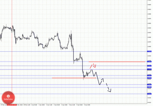 По паре Доллар/Франк ключевым уровня являются: 0.9434, 0.9391, 0.9372, 0.9358, 0.9331, 0.9320, 0.9292, 0.9281 и 0.9252. Здесь продолжения развития нисходящего цикла от 28 марта ожидаем после прохода ценой шумового диапазона 0.9331 – 0.9320, в данном случае цель 0.9292, в коридоре 0.9292 – 0.9281 консолидация цены. Потенциальным значением для низа считаем уровень 0.9252, по достижении которого ожидаем откат кверху. Краткосрочное восходящее движение возможно в коридоре 0.9358 – 0.9372, пробой последнего значения приведет к углубленной коррекции, здесь цель 0.9391, от этого уровня возможен разворот книзу, его пробой будет располагать к формированию восходящей структуры, в данном случае потенциальная цель – 0.9434.