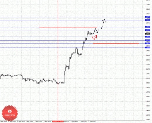 По паре Евро/Иена ключевыми уровнями являются: 130.79, 130.26, 129.07, 128.53, 127.35, 126.75, 126.22 и 125.49. Здесь мы продолжаем следить за развитием восходящего цикла от 3 апреля. Краткосрочное восходящее движение возможно в коридоре 128.53-129.07, пробой последнего значения должен сопровождаться выраженным восходящим движением, в данном случае цель 130.26. Потенциальным значением для верха считаем уровень 130.79, по достижении которого ожидаем консолидированное движение в коридоре 130.26 – 130.79. Краткосрочное нисходящее движение возможно в коридоре 127.35 – 126.75, пробой последнего значения приведет к углубленной коррекции, здесь цель 126.22, от этого уровня ожидаем ключевой разворот кверху, его пробой будет располагать к формированию нисходящей структуры, в данном случае потенциальная цель – 125.50.