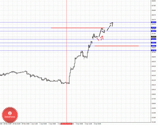 По паре Фунт/Иена ключевыми уровнями являются: 154.13, 152.93, 152.17, 150.36, 149.57, 148.87 и 147.86. Здесь мы продолжаем следить за восходящей структурой от 4 апреля. Краткосрочное восходящее движение возможно в коридоре 152.17 – 152.93, пробой последнего значения позволит рассчитывать на движение к потенциальной цели – 154.13, по достижении этого уровня ожидаем откат книзу. Краткосрочное нисходящее движение возможно в коридоре 150.36 – 149.57, пробой последнего значения приведет к углубленному движению, здесь цель 148.87, от этого значения существует вероятность разворота кверху, его пробой будет располагать к формированию начальных условий для нисходящего цикла, в данном случае потенциальная цель – 147.86.