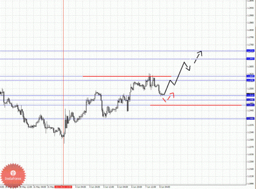 По паре Евро/Доллар важными уровнями являются: 1.2731, 1.2693, 1.2609, 1.2590, 1.2518, 1.2496, 1.2471 и 1.2406. Здесь ключевые цели остались без изменения и мы продолжаем следить за формированием восходящей структуры от 1 июня. Продолжения движения кверху ожидаем после прохода ценой шумового диапазона 1.2590 – 1.2609, в данном случае цель 1.2693. Потенциальным значением для верха считаем уровень 1.2731, по достижении которого ожидаем консолидированное движение. В коридоре 1.2518 – 1.2496 возможно краткосрочное нисходящее движение, пробой последнего значения приведет к углубленному движению, в данном случае цель 1.2471, от этого уровня высока вероятность разворота кверху, его пробой окажет негативное влияние на формирование восходящей структуры от 1 июня, в данном случае потенциальная цель 1.2406.