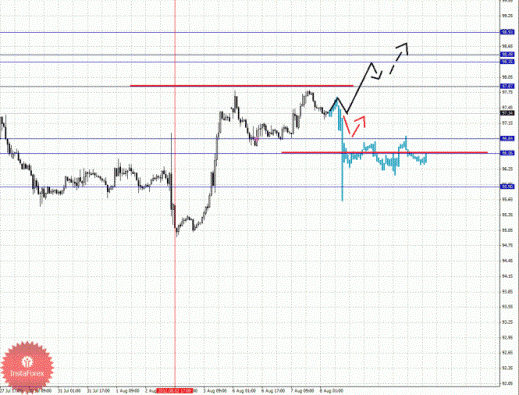 По паре Евро/Иена ключевыми уровнями являются: 98.93, 98.49, 98.35, 97.87, 97.33, 96.84, 96.56 и 95.90. Здесь продолжения развития восходящей структуры от 2 августа ожидаем после пробоя 97.87, в данном случае первая цель 98.35, в коридоре 98.35 – 98.49 консолидация цены. Потенциальным значением для верха считаем уровень 98.93, по достижении которого ожидаем откат книзу. Диапазон 96.84 – 96.56 является ключевой поддержкой, в нем мы ожидаем краткосрочное нисходящее движение, пробой уровня 95.56 окажет негативное влияние на развитие восходящей тенденции в масштабе Н1, в данном случае потенциальная цель 95.90, до этого уровня ожидаем оформления начальных условий для определения последующих целей.