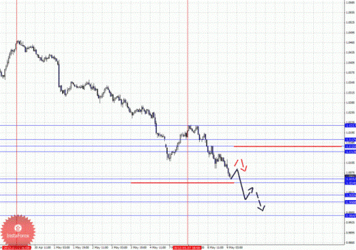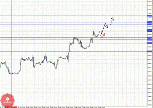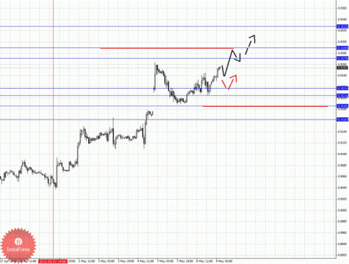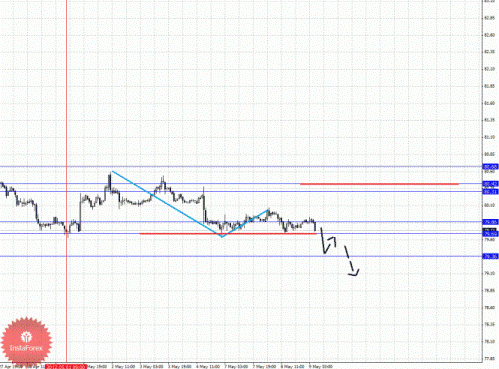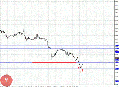 По паре Евро/Доллар цена пока не вышла из корректировочной зоны и здесь мы не наблюдаем начальных условий для развития восходящей структуры. По паре Доллар/Франк также продолжаем следить за восходящей структурой от 1 мая. По паре Фунт/Доллар пока не создано каких – либо условий для движения кверху. По паре Доллар/Йена цена близка к отмене восходящей структуры от 1 мая. По паре Евро/Йена продолжения движения книзу ожидаем после пробоя 103.25. По паре Фунт/Йена продолжаем следить за локальной структурой от 2 мая.