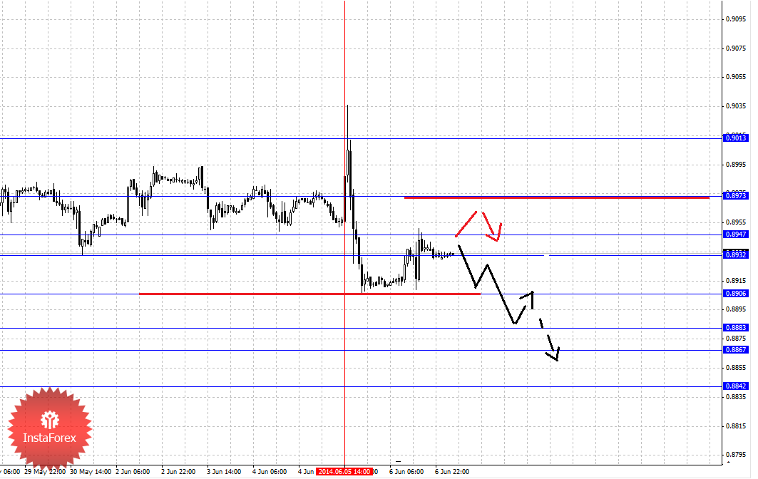 По паре Доллар/Франк ключевыми уровнями в масштабе Н1 являются: 0.8973, 0.8947, 0.8932, 0.8906, 0.8883, 0.8867 и 0.8842. Здесь мы продолжаем следить за нисходящей структурой от 5 июня. Продолжения движения книзу ожидаем после пробоя 0.8906, в данном случае цель – 0.8883, возле этого уровня консолидация цены. Проход ценой уровня 0.8867 будет располагать к развитию направленного движения, в данном случае потенциальная цель – 0.8842. Краткосрочное восходящее движение возможно в коридоре 0.8932 – 0.8947, пробой последнего значения приведет к затяжной коррекции, в данном случае потенциальная цель – 0.8973.