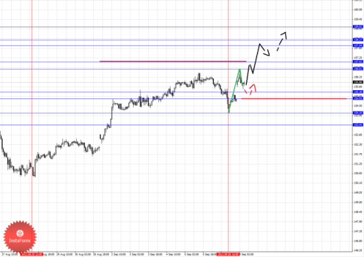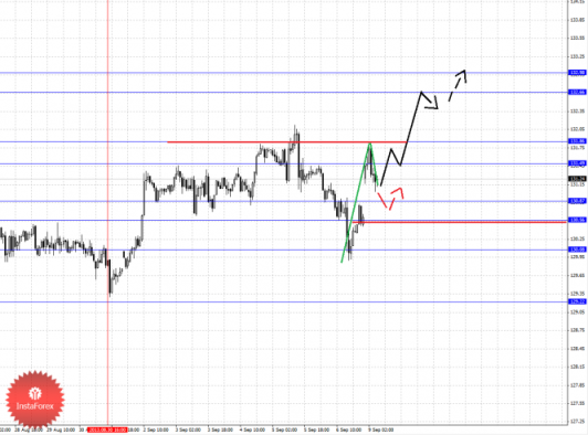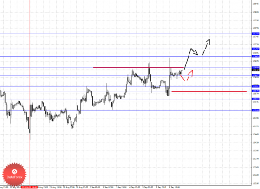 По паре Доллар/Иена ключевыми уровнями являются: 101.79, 101.31, 101.07, 100.47, 100.16, 99.34, 99.06 и 98.53. Здесь от 6 сентября формируется локальная структура для продолжения развития восходящей тенденции в масштабе Н1. Продолжения движения кверху ожидаем после пробоя 100.16, в данном случае цель 100.47, в этом диапазоне консолидация цены. Пробой уровня 100.50 должен сопровождаться выраженным восходящим движением, здесь цель – 101.07, в коридоре 101.07–101.31 консолидация цены. Потенциальным значением для верха считаем уровень 101.79, по достижении которого ожидаем откат книзу. Краткосрочное нисходящее движение возможно в коридоре 99.34–99.06, отсюда высока вероятность разворота кверху, пробой уровня 99.06 будет располагать к развитию нисходящего движения и здесь первая цель – 98.53.