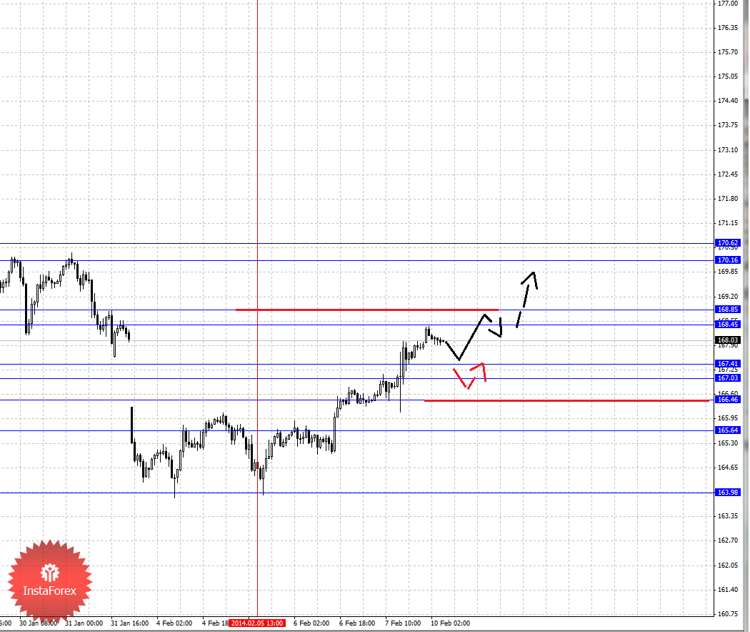 По паре Фунт/Иена ключевыми уровнями являются: 170.62, 170.16, 168.85, 168.45, 167.41, 167.03, 166.46 и 165.64. Здесь мы следим за развитием восходящей структуры от 5 февраля. Продолжения восходящей тенденции ожидаем после прохода ценой шумового диапазона 168.45 – 168.86, в данном случае цель – 170.16. Потенциальным значением для верха считаем уровень 170.62, по достижении которого ожидаем консолидацию в коридоре 170.16- 170.62. Краткосрочное нисходящее движение возможно в коридоре 167.41 – 167.03, пробой последнего значения приведет к углубленной коррекции, здесь цель – 166.46, от этого уровня ожидаем ключевой разворот кверху, его проход ценой будет располагать к развитию нисходящей тенденции, в данном случае первая цель – 165.64.