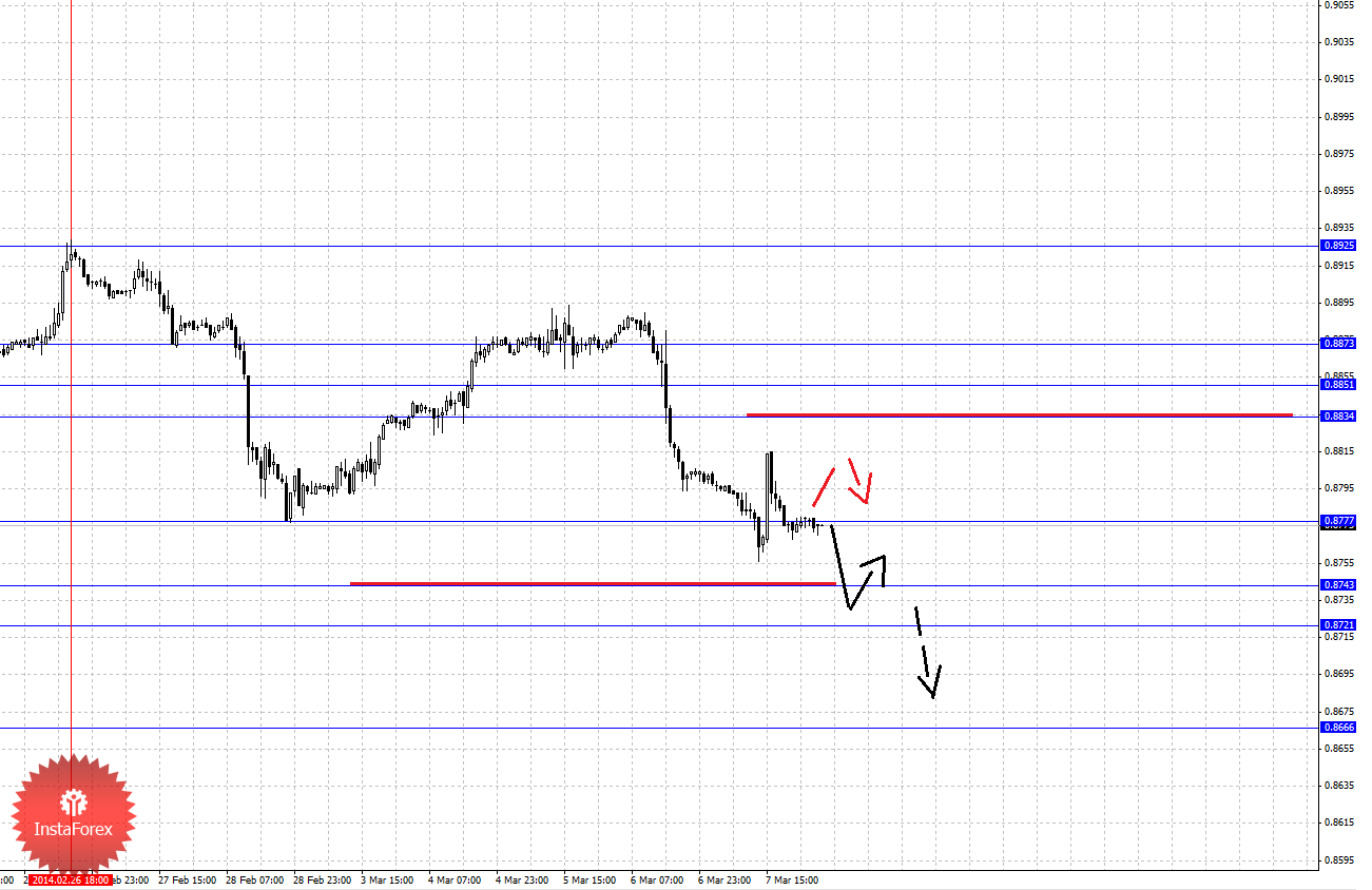 По паре Доллар/Канадский доллар ключевыми уровнями являются: 1.1191, 1.1156, 1.1134, 1.1088, 1.1066, 1.1025 и 1.0953. Здесь от 6 марта формируется потенциал для восходящего цикла. Краткосрочное восходящее движение ожидаем в коридоре 1.1134 – 1.1156, отсюда высока вероятность разворота в корректировочною зону. Пробой уровня 1.1156 позволит рассчитывать на движение к потенциальной цели – 1.1191, возле которого, ожидаем консолидацию. Краткосрочное нисходящее движение возможно в коридоре 1.1088 – 1.1066, пробой последнего значения приведет к углубленной коррекции, здесь цель – 1.1025, от этого уровня мы ожидаем ключевой разворот кверху, его проход ценой будет располагать к развитию нисходящей структуры, в данном случае цель – 1.0953.