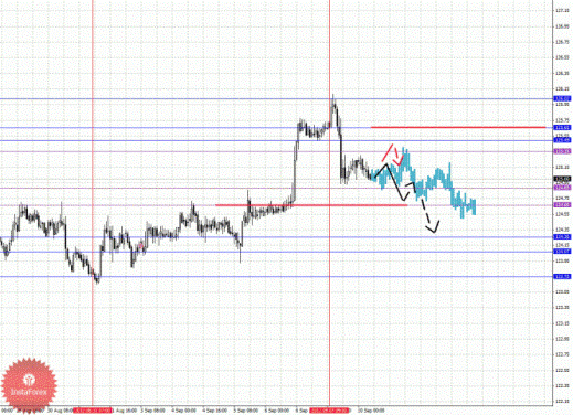 По паре Фунт/Иена ключевыми уровнями являются: 126.02, 126.65, 125.49, 125.35, 124.89, 124.66, 124.26, 124.07 и 123.75. Здесь от 7 сентября формируется потенциал для нисходящего движения. Краткосрочное движение книзу ожидаем в коридоре 124.89 – 124.66, пробой последнего значения должен сопровождаться выраженным нисходящим движением, в данном случае цель 124.26, в коридоре 124.26 – 124.07 консолидация цены. Потенциальным значением для низа считаем уровень 123.75, по достижении которого ожидаем откат кверху. Краткосрочное восходящее движение возможно в коридоре 125.35 – 125.49, пробой последнего значения приведет к углубленному движению, в данном случае цель 125.65, от этого уровня высока вероятность разворота книзу, его пробой окажет негативное влияние на развитие нисходящей структуры от 7 сентября, здесь потенциальная цель 126.02.