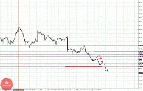По паре Доллар/Йена ключевыми уровнями являются: 81.84, 81.35, 81.14, 80.99, 80.46, 80.22 и 79.70. Здесь мы продолжаем следить за нисходящей структурой от 2 апреля. Потенциальной целью для низа, на текущий момент, является уровень 80.46, по достижении которого, ожидаем консолидированное движение в коридоре 80.46 – 80.22. Пробой уровня 80.22 позволит рассчитывать на движение к 79.70, по достижении этого уровня ожидаем откат кверху. Краткосрочное восходящее движение возможно в коридоре 80.99 – 81.14, пробой последнего значения приведет к углубленной коррекции, в данном случае цель – 81.35, от этого уровня высока вероятность разворота книзу, его пробой будет располагать к формированию восходящей структуры, здесь потенциальная цель – 81.84.