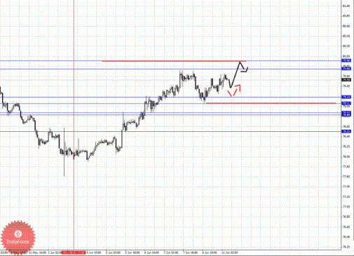 По паре Доллар/Йена ключевыми уровнями являются: 79.96, 79.80, 79.24, 79.11, 78.92, 78.88 и 78.55. Здесь ключевые цели остались без изменения. Краткосрочное нисходящее движение ожидаем в коридоре 79.24 – 79.11, пробой последнего значения приведет к развитию затяжной коррекции, в данном случае цель 78.92, возле этого уровня консолидация цены, также до него мы ожидаем оформления начальных условий для определения последующих целей. Уровень 78.55 интересен с точки зрения среднесрочной перспективы. Для продолжения развития восходящей структуры от 1 июня ожидаем оформления локальных начальных условий, что должно произойти до 79.80. Диапазон 79.80 – 79.96 шумовой.