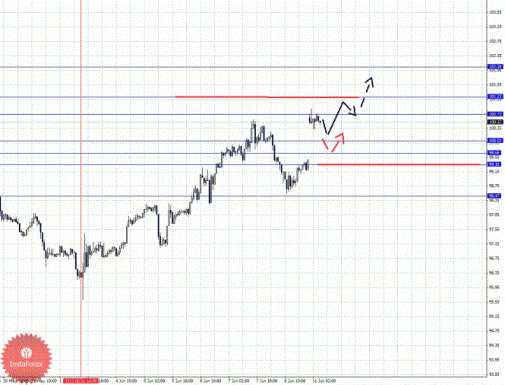 По паре Евро/Йена ключевыми уровнями являются: 102.04, 101.22, 100.73, 100.01, 99.66, 99.35, 98.47. Здесь мы продолжаем следить за среднесрочной восходящей структурой от 1 июня. Краткосрочное восходящее движение ожидаем в коридоре 100.73 – 101.22, пробой последнего значения должен сопровождаться выраженным восходящим движением, в данном случае потенциальная цель – 102.04, по достижении этого уровня ожидаем откат книзу. Краткосрочное нисходящее движение возможно в коридоре 100.01 – 99.66, пробой последнего значения приведет к углубленному движению, в данном случае цель – 99.35, от этого уровня высока вероятность разворота кверху, его пробой будет располагать к формированию нисходящей структуры, здесь потенциальная цель – 98.47.