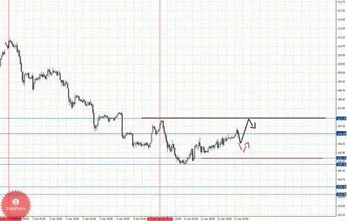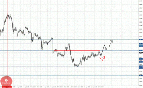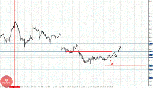 Здесь мы продолжаем следить за развитием восходящего цикла от 9 апреля. По паре Доллар/Франк пока не наблюдаем каких-либо начальных условий для движения кверху и рассматриваем данную тенденцию в качестве коррекции. По паре Фунт/Доллар пока продолжаем следить за восходящей структурой от 10 апреля. По паре Доллар/Йена основной структурой остается нисходящая от 2 апреля, в целом, оформления начальных условий для верха ожидаем после пробоя 81.35. По паре Евро/Йена пока не наблюдаем выраженных начальных условий для восходящего движения. По паре Фунт/Йена мы наметили цели для верха, однако здесь возможно оформления больших начальных условий.