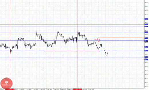 По паре Доллар/Иена ключевыми уровнями являются: 79.19, 79.00, 78.90, 78.70, 78.48, 78.38, 78.14, 78.00, 77.76 и 77.66. Здесь отмены развития восходящей структуры от 1 августа ожидаем после пробоя 78.14, в данном случае цель 78.00, в этом коридоре консолидация цены. Пробой уровня 78.00 должен сопровождаться импульсивным движением к уровню 77.76. Потенциальным значением для низа считаем уровень 77.66, по достижении которого ожидаем консолидацию в коридоре 77.66 – 77.76. Краткосрочное восходящее движение возможно в коридоре 78.38 – 78.48, пробой последнего значения будет располагать к формированию восходящей тенденции, в данном случае первая цель – 78.70. Далее ключевые уровни для верха остались без изменения.