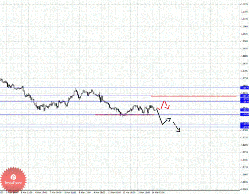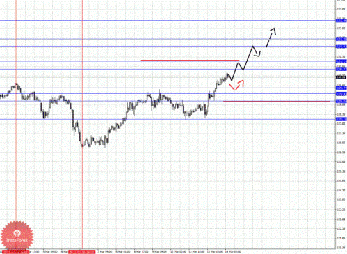 По паре Евро/Доллар мы продолжаем следить за нисходящей структурой от 8 марта. По паре Доллар/Франк следим за развитием структуры от 8 марта. По паре Фунт/Доллар цена находится в корректировочной области от нисходящей структуры 29 февраля, также здесь наблюдается небольшой потенциал для восходящей тенденции, однако в качестве основной мы рассматриваем нисходящую. По паре Доллар/Йена пока нет каких-либо начальных условий для развития нисходящей структуры. По паре Евро/Йена ситуация осталась без изменения, и здесь мы продолжаем следить за восходящей структурой от 6 марта. По паре Фунт/Йена следим за развитием восходящего цикла от 6 марта.