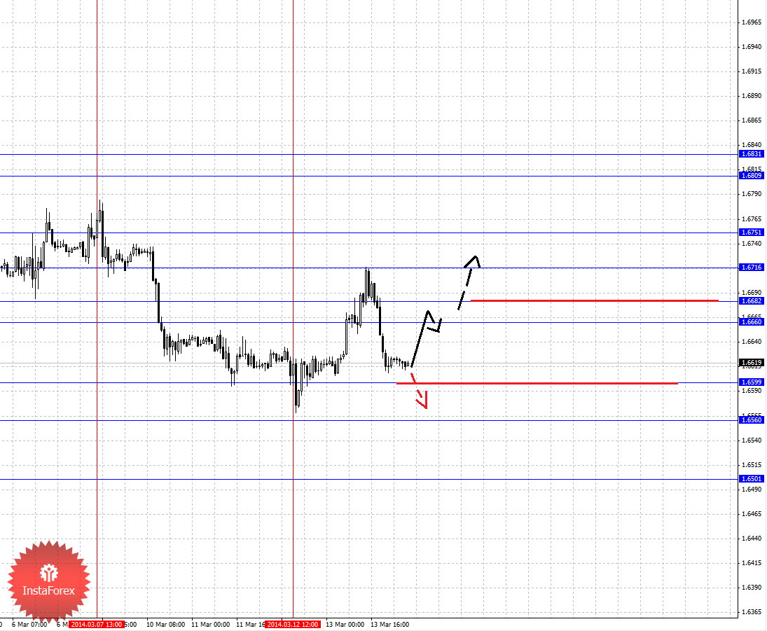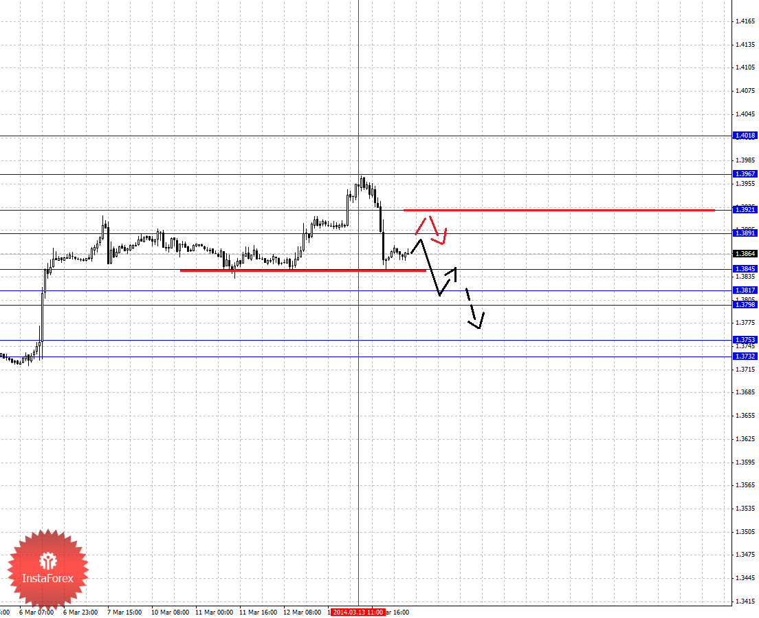 По паре Евро/Доллар важными уровнями являются: 1.4018, 1.3967, 1.3921, 1.3891, 1.3845, 1.3817, 1.3798, 1.3753 и 1.3732. Здесь от 13 марта формируется небольшой потенциал для нисходящего движения. Продолжения движения книзу ожидаем после пробоя 1.3845, в данном случае цель – 1.3817, возле этого уровня консолидация цены. Проход ценой уровня 1.3798 должен сопровождаться выраженным нисходящим движением, в данном случае цель – 1.3753. Потенциальным значением для низа считаем уровень 1.3732, по достижении которого, ожидаем консолидацию. Краткосрочное восходящее движение возможно в коридоре 1.3891 – 1.3921, пробой последнего значения будет располагать к развитию восходящей структуры, в данном случае цель – 1.3967. Потенциальным значением для верха пока считаем уровень 1.4018.