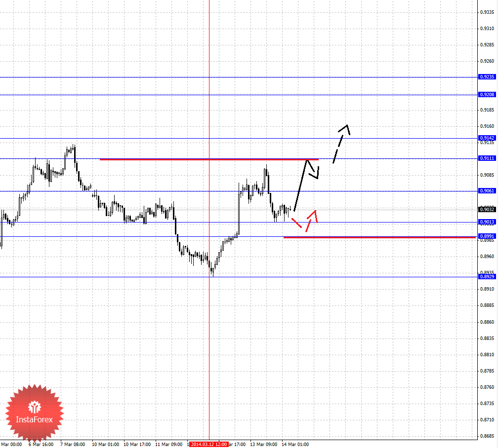 По паре Австралийский доллар/Доллар ключевыми уровнями являются: 0.9235, 0.9208, 0.9142, 0.9111, 0.9061, 0.9013, 0.8991 и 0.8929. Здесь от 12 марта оформилась начальная структура для восходящего цикла. Продолжения движения кверху ожидаем после пробоя 0.9061, в данном случае цель – 0.9111, в коридоре 0.9111 – 0.9142 консолидация цены. Пробой уровня 0.9145 приведет к развитию выраженного восходящего движения, в данном случае цель – 0.9208. Потенциальным значением для верха считаем уровень 0.9235, по достижении которого ожидаем консолидированное движение. Краткосрочное нисходящее движение возможно в коридоре 0.9013 – 0.8991, пробой последнего значения окажет негативное влияние на развитие восходящей структуры в масштабе Н1, в данном случае потенциальная цель – 0.8929.