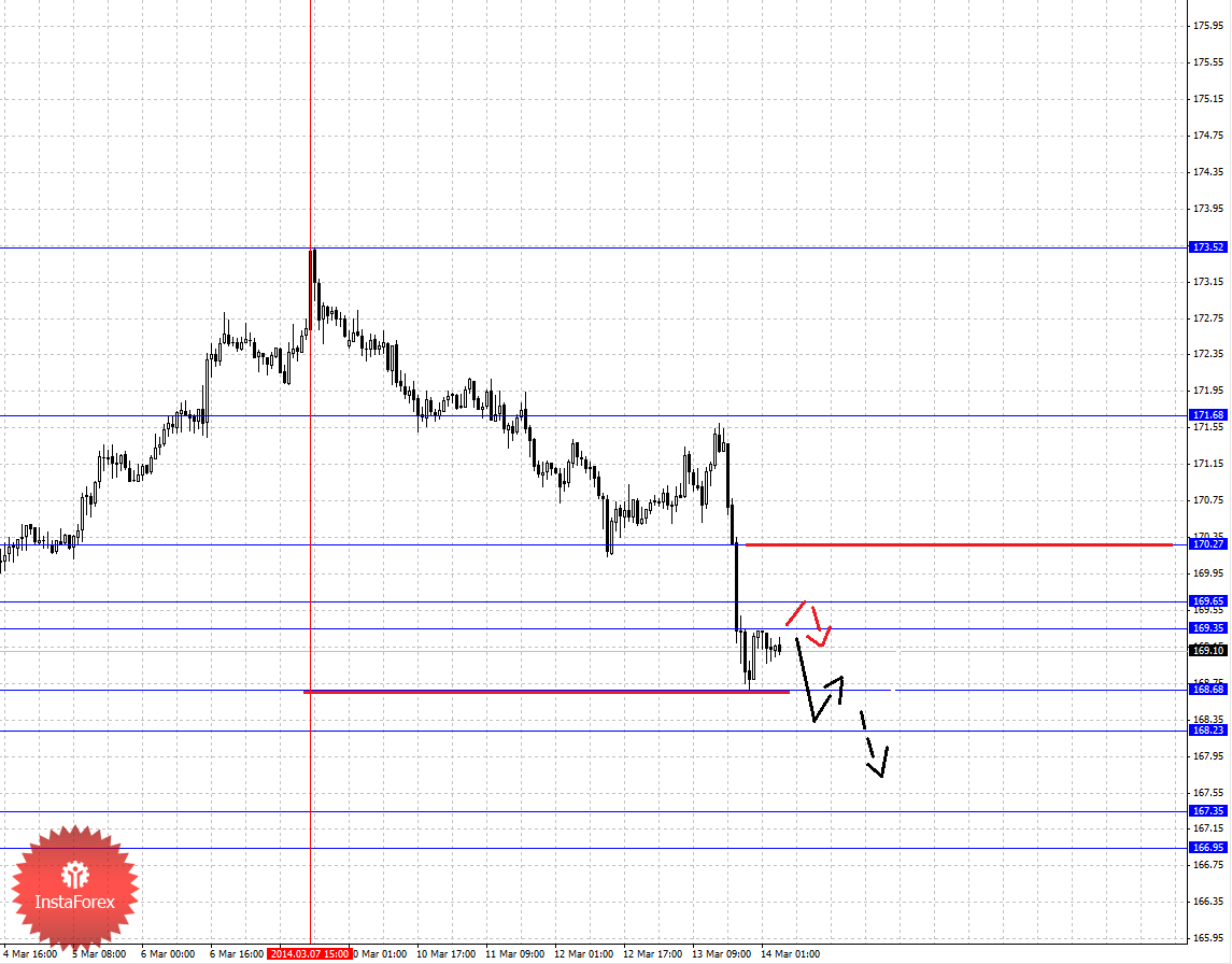 По паре Фунт/Иена ключевыми уровнями являются: 171.68, 170.27, 169.65, 169.35, 168.68, 168.23, 167.35 и 166.95. Здесь мы продолжаем следить за нисходящей структурой от 7 марта. Краткосрочное движение книзу ожидаем в коридоре 168.68 – 168.23, пробой последнего значения должен сопровождаться выраженным нисходящим движением, здесь цель – 167.35. Потенциальным значением для низа считаем уровень 166.95, по достижении которого ожидаем консолидацию. Краткосрочное восходящее движение возможно в коридоре 169.35 – 169.65, пробой последнего значения приведет к углубленной коррекции, здесь цель – 170.27.