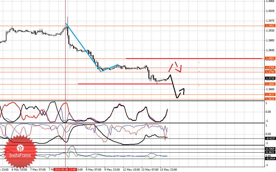 По паре Евро/Доллар ключевыми уровнями в масштабе Н1 являются: 1.3802, 1.3760, 1.3740, 1.3684, 1.3637 и 1.3615. Здесь продолжения движения книзу ожидаем после пробоя 1.3684, в данном случае цель – 1.3637. Потенциальным значением для низа считаем уровень 1.3615 по достижении которого ожидаем консолидацию. Краткосрочное восходящее движение возможно в коридоре 1.3740 – 1.3760, пробой последнего значения приведет к движению до уровня 1.3802, до которого мы ожидаем формирование потенциала для развития восходящего цикла.
