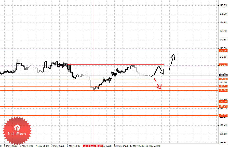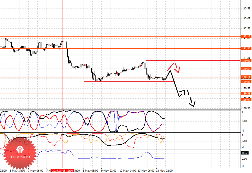По паре Евро/Иена ключевыми уровнями в масштабе Н1 являются: 142.16, 141.55, 140.93, 140.54, 140.11, 139.88, 139.28 и 138.97. Здесь мы продолжаем следить за нисходящей структурой от 8 мая. Продолжения движения книзу ожидаем после прохода ценой шумового диапазона 140.11 – 139.88, в данном случае цель – 139.28, потенциальным значением для нисходящей структуры считаем уровень 138.97, по достижении которого ожидаем консолидацию. Краткосрочное восходящее движение возможно в коридоре 140.54 – 140.93, пробой последнего значения приведет к затяжной коррекции, здесь цель – 141.55, от этого уровня ожидаем ключевой разворот книзу, его проход ценой будет располагать к развитию восходящей структуры, в данном случае цель – 142.16.