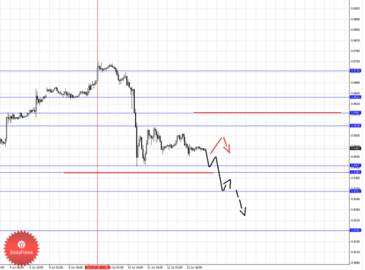 По паре Доллар/Франк ключевым уровня являются: 0.9720, 0.9633, 0.9581, 0.9538, 0.9407, 0.9384, 0.9322 и 0.9192. Здесь, нисходящую структуру от 9 июля мы рассматриваем в качестве потенциальных начальных условий. Продолжения движения книзу ожидаем после прохода ценой шумового диапазона 0.9407–0.9384, в данном случае цель – 0.9322, возле этого уровня консолидация цены. Пробой 0.9322 должен сопровождаться выраженным нисходящим движением, в данном случае цель 0.9192, по достижении которого ожидаем консолидацию. Корректировочное восходящее движение возможно в коридоре 0.9538–0.9581, пробой последнего значения приведет к углубленному движению, здесь цель – 0.9633, от этого уровня высока вероятность разворота книзу, его пробой будет располагать к развитию восходящей структуры, в данном случае цель – 0.9720.