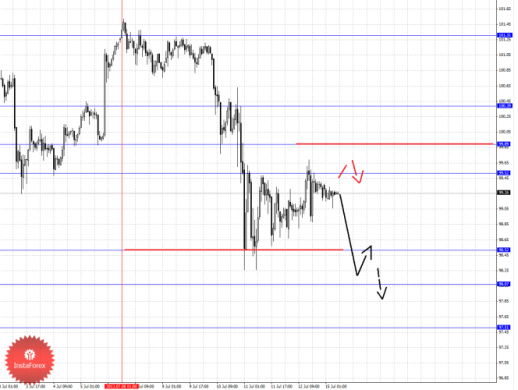 По паре Доллар/Иена ключевыми уровнями являются: 101.31, 100.39, 99.89, 99.52, 98.52, 98.07, 97.51, 96.24 и 95.75. Здесь цена отменила развитие восходящей структуры и на текущий момент мы следим за формированием нисходящего потенциала от 8 июля. Краткосрочное нисходящее движение ожидаем в диапазоне 98.52–98.07, пробой последнего значения приведет к развитию нисходящего цикла и здесь первая цель 97.51, возле этого уровня возможна консолидация цены. Пробой 97.50 должен сопровождаться развитием импульса, в данном случае цель – 96.24. Потенциальным значением для низа пока считаем уровень 95.75, по достижении которого ожидаем консолидацию. Корректировочное восходящее движение возможно в коридоре 99.52–99.89, пробой последнего значения приведет к углубленному движению, здесь цель 100.39, от этого уровня мы ожидаем ключевой разворот книзу, его пробой будет располагать к развитию восходящей структуры, в данном случае потенциальная цель – 101.31.