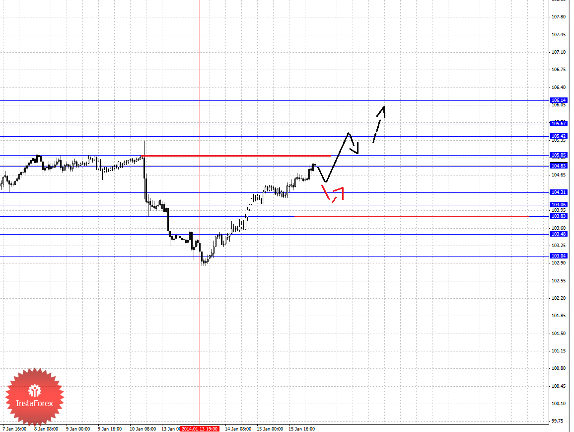 По паре Доллар/Иена ключевыми уровнями являются: 106.14, 105.67, 105.42, 105.05, 104.83, 104.31, 104.06, 103.83, 103.48 и 103.04. Здесь продолжения развития восходящей структуры от 13 января ожидаем после прохода ценой шумового диапазона 104.83 – 105.05, в данном случае цель – 105.42, в коридоре 105.42 – 105.67 консолидация цены. Потенциальным значением для верха считаем уровень – 106.14, по достижении которого ожидаем откат книзу. Краткосрочное нисходящее движение возможно в коридоре 104.31 – 104.06, пробой последнего значения позволит рассчитывать на движение к 103.83, который является ключевой поддержкой для верха, его проход ценой будет располагать к развитию нисходящей структуры, здесь первая цель – 103.48.